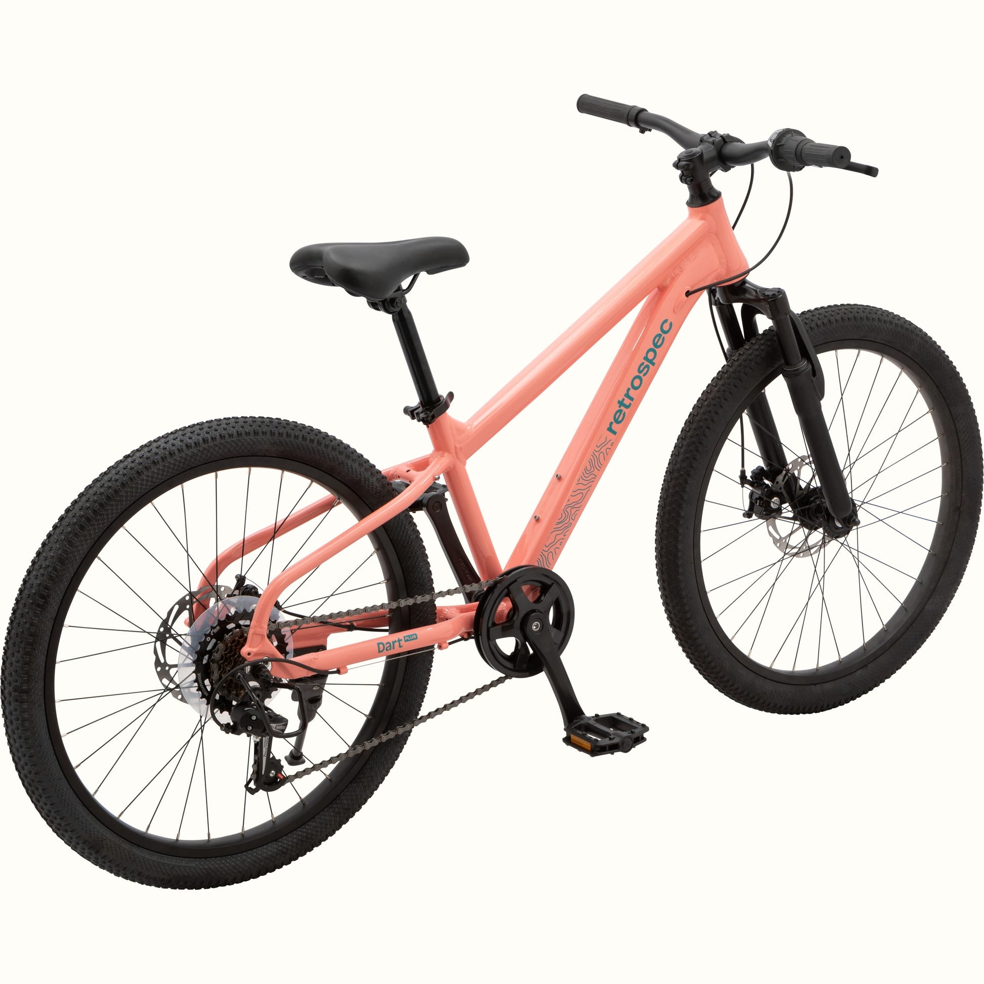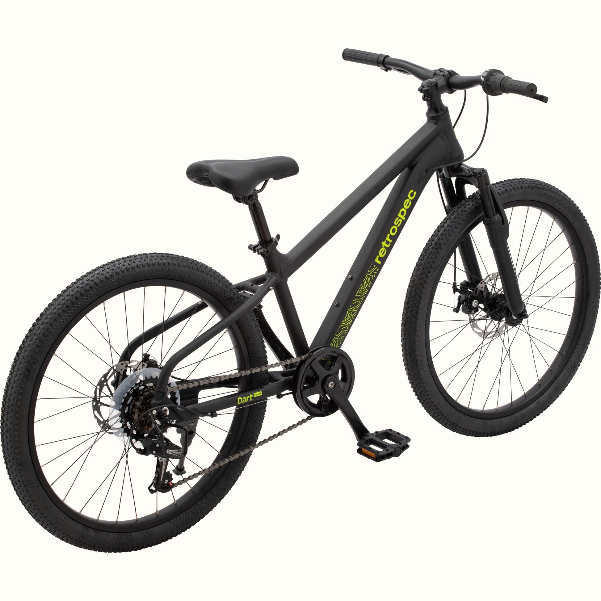 Dart Plus is the ultimate bike for big kids who are ready to explore beyond the cul-de-sac. Designed with premium features that show them what their first grown-up bike will be like, Dart Plus gives kids a head start on mastering adult-level riding. With a lightweight aluminum frame, kid-specific geometry, and 50mm front suspension fork, the riding is smooth and handling is a breeze. A Shimano 7-speed drivetrain and twist-grip shifters give them the tools to master hills and longer rides, while front & rear mechanical disc brakes pack serious stopping power for ultimate control. Designed with growing riders in mind, Dart Plus offers an ergonomic fit, adjustable height, and cushy, shock-absorbing tires for all-day comfort. It’s more than just a bigger kids’ bike – it’s their ticket to better, bolder bike rides.