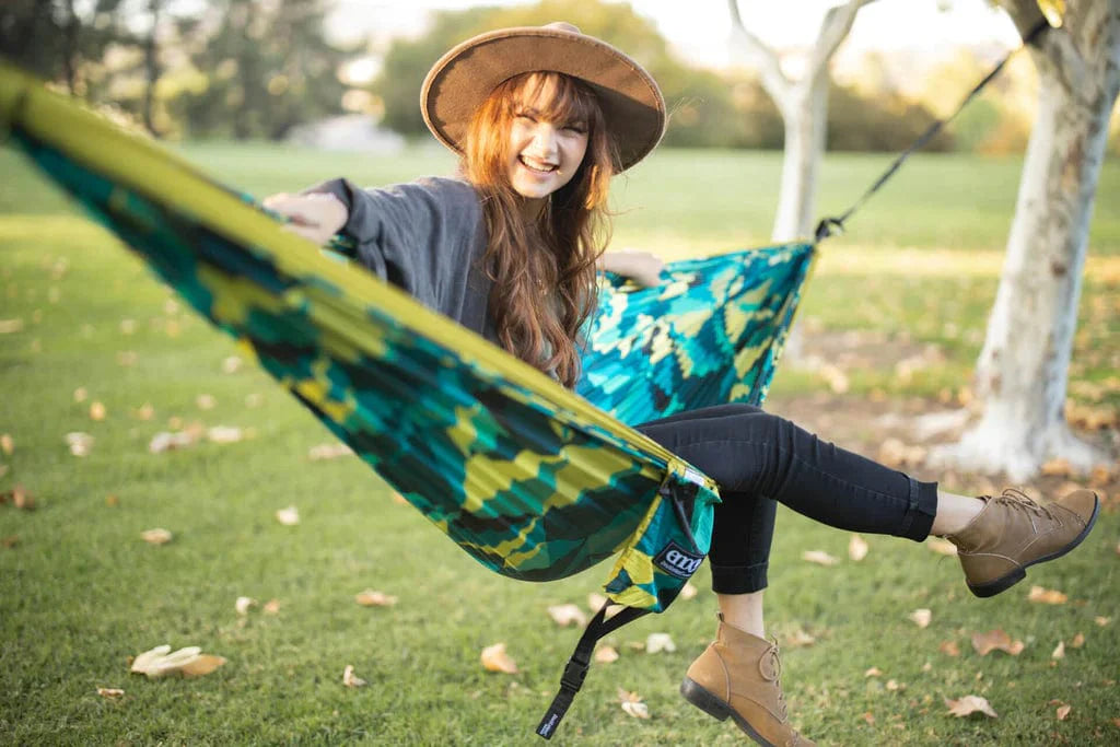 Brighten your adventures with the colorful and spacious ENO DoubleNest Hammock Print featuring durable yet soft FreeWave® fabric that delivers a sharable experience unlike any other.