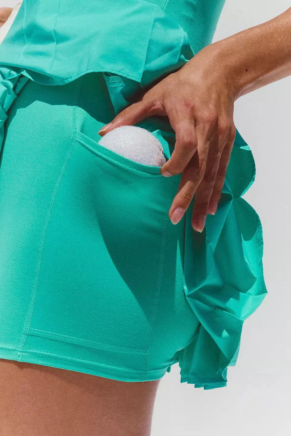 Features: Soft fabrication at body, durable nylon skirt in a water-resistant material, built-in shorts with four-way stretch and side-thigh pockets, scoop neckline, fixed elastic shoulder straps with low scoop back, 2-ply shelf bra for a supportive feel, seam at underbust for shaping, shaped waistband